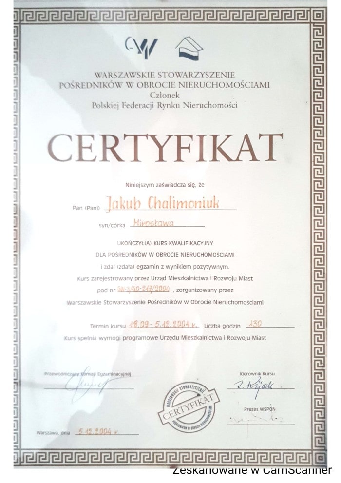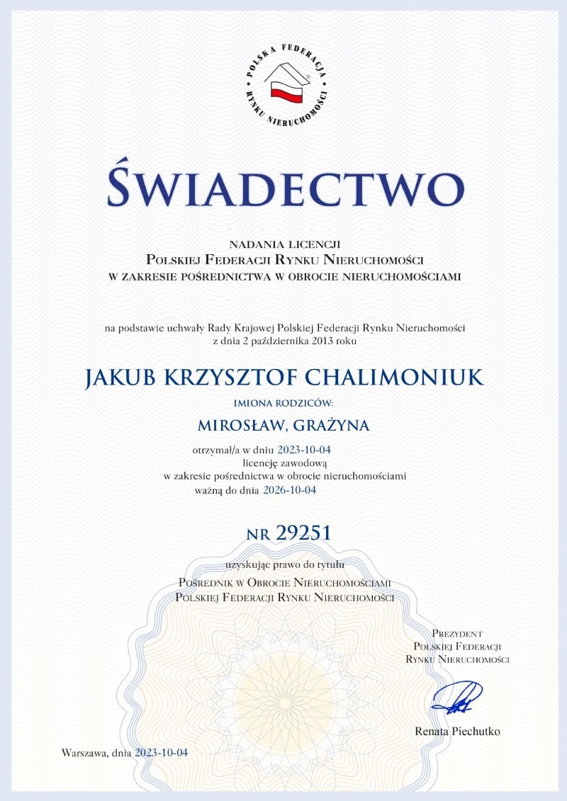 Nazywam się Kuba Chalimoniuk i jestem licencjonowanym pośrednikiem w obrocie nieruchomościami. Swoją przygodę zaczynałem 20 lat temu. Przez te wszystkie lata dążyłem, aby wykonywać zawód pośrednika profesjonalnie i uczciwie. Pracując, zarządzając i rozwijając firmy z branży, wyciągnąłem wiele pozytywnych rzeczy, które skutkują tym, że każda z ponad 800 transakcji w jakich brałem udział była bezpieczna, zakończyła się powodzeniem, i co najważniejsze, satysfakcją klientów, która jest dla mnie najcenniejsza. Osobiście specjalizuję się w nieruchomościach gruntowych , sprzedaży domów oraz współpracą z deweloperami.